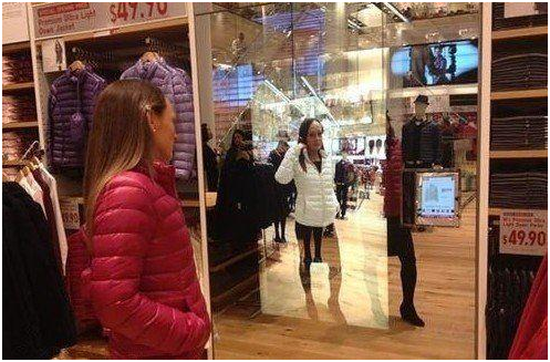 AR虛擬現(xiàn)實技術(shù)目前在購物中的應(yīng)用主要還是停留在虛擬試穿、虛擬產(chǎn)品展示、虛擬宣傳品展示上。優(yōu)衣庫在美國圣地亞哥的 NDP虛擬試衣系統(tǒng)。